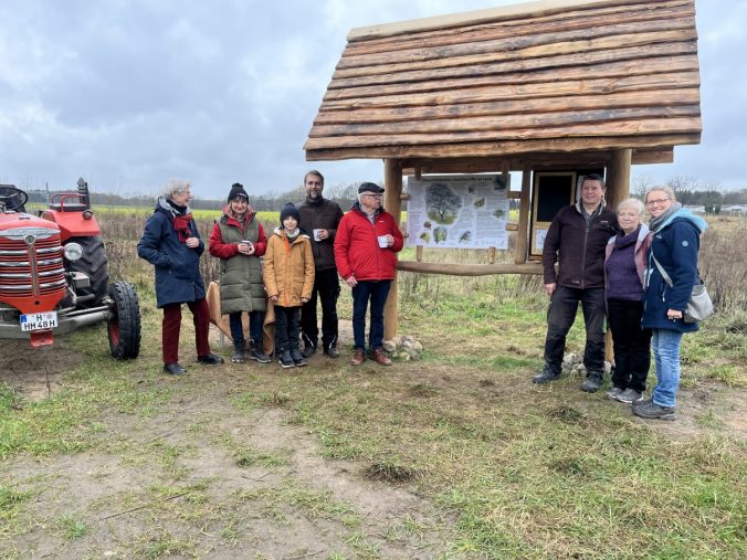 Es ist geschafft! Nachdem wir über den Oktober und November hinweg Stück für Stück das Dach des Gerüstes für unsere Infotafel am Langen Feld gedeckt haben, konnten wir am vergangenen Sonntag, dem 7.12.25, endlich mit einer Tasse heißen Glühweins auf die Fertigstellung anstoßen. Unzählige Arbeitsstunden haben wir gestemmt, gebohrt, gemessen und gerichtet. Aber alle waren sich an diesem Tag einig: Es hat sich auf jeden Fall gelohnt!