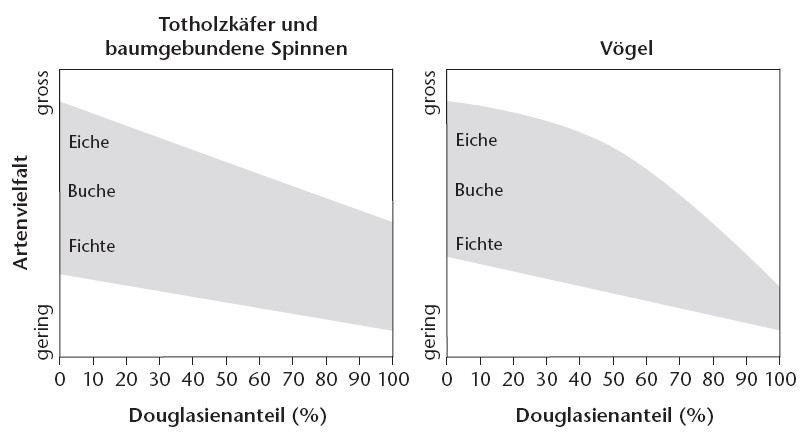 Wie sich, zum Beispiel, der Anteil an beigemischten Douglasien in jeweiligen Waldmischungen mit einheimischer (Stiel-/Trauben-)Eiche, (Rot-)Buche und Fichte negativ auf die Artenvielfalt bei Totholzkäfern und baumgebundenen Spinnen sowie bei Vögeln auswirkt, lässt sich in der Abbildung unten einfach erkennen: je höher der Douglasienanteil in einem Wald, desto geringer die Artenvielfalt.