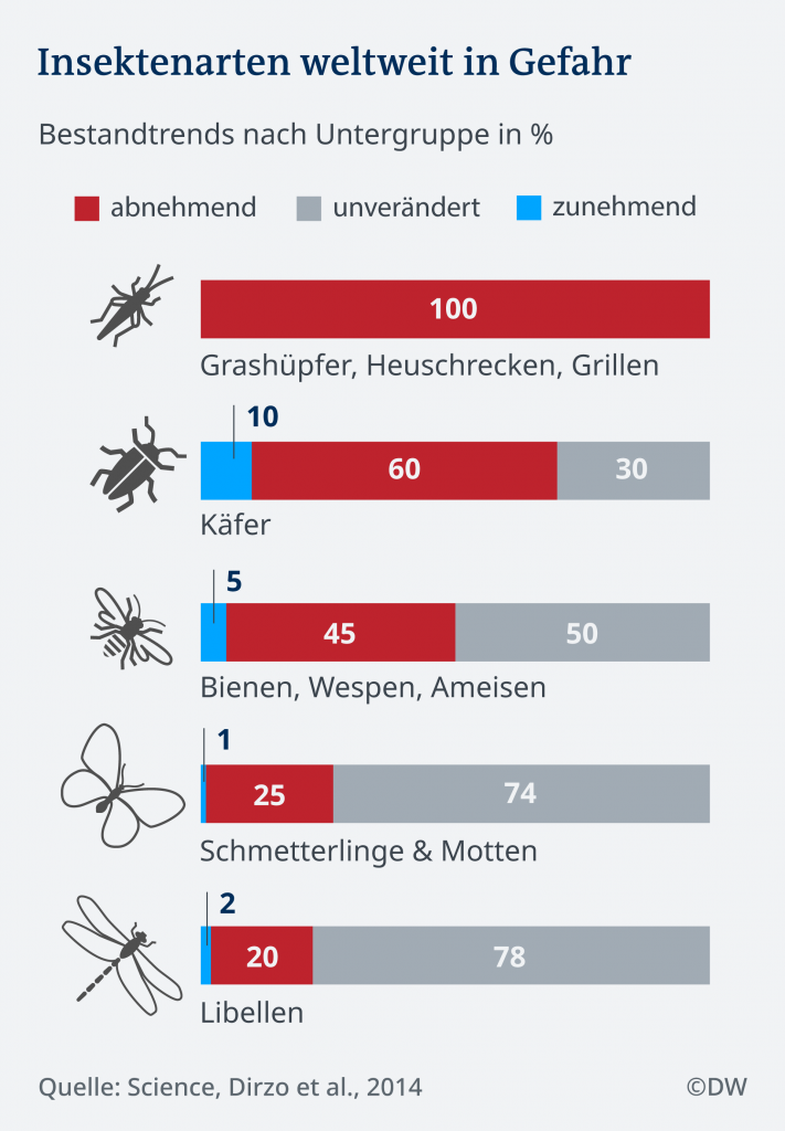 Neben dem Klimawandel ist der ungebremste Verlust an Artenvielfalt das zweite große, hausgemachte Problem unserer Zeit. Noch nie war die Geschwindigkeit eines Artensterbens auf der Erde so hoch wie heute. Vor allem Insekten, welche rund drei Viertel aller Arten auf unserer Erde ausmachen, leiden besonders stark, wie die Grafik links erkennen lässt. Demnach nehmen bei den Bienen, Wespen und Ameisen fast die Hälfte der Arten in ihren Beständen ab, bei den Schmetterlingen sind es ein Viertel aller Arten.